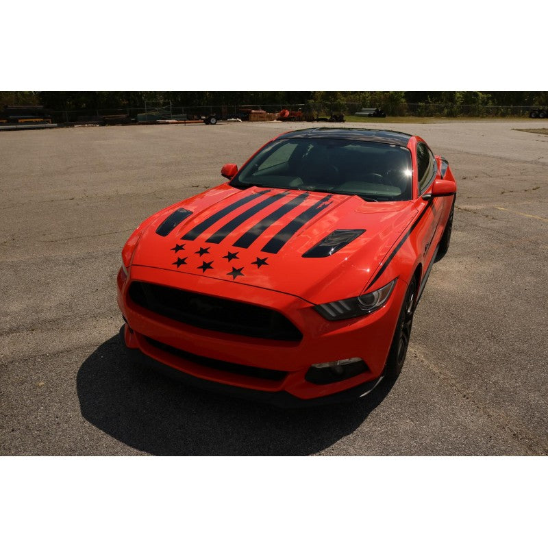 Our vinyl graphic is made from high-quality materials that are designed to withstand the elements, including UV rays, rain, and wind. Perfectly cut to fit. Templated for perfect placement and installation on your 2015-2017 Mustang Hood. This comes in three sections: stars with transfer tape, alignment template for placement of the stripes (image is shown), and 4 stripes.
